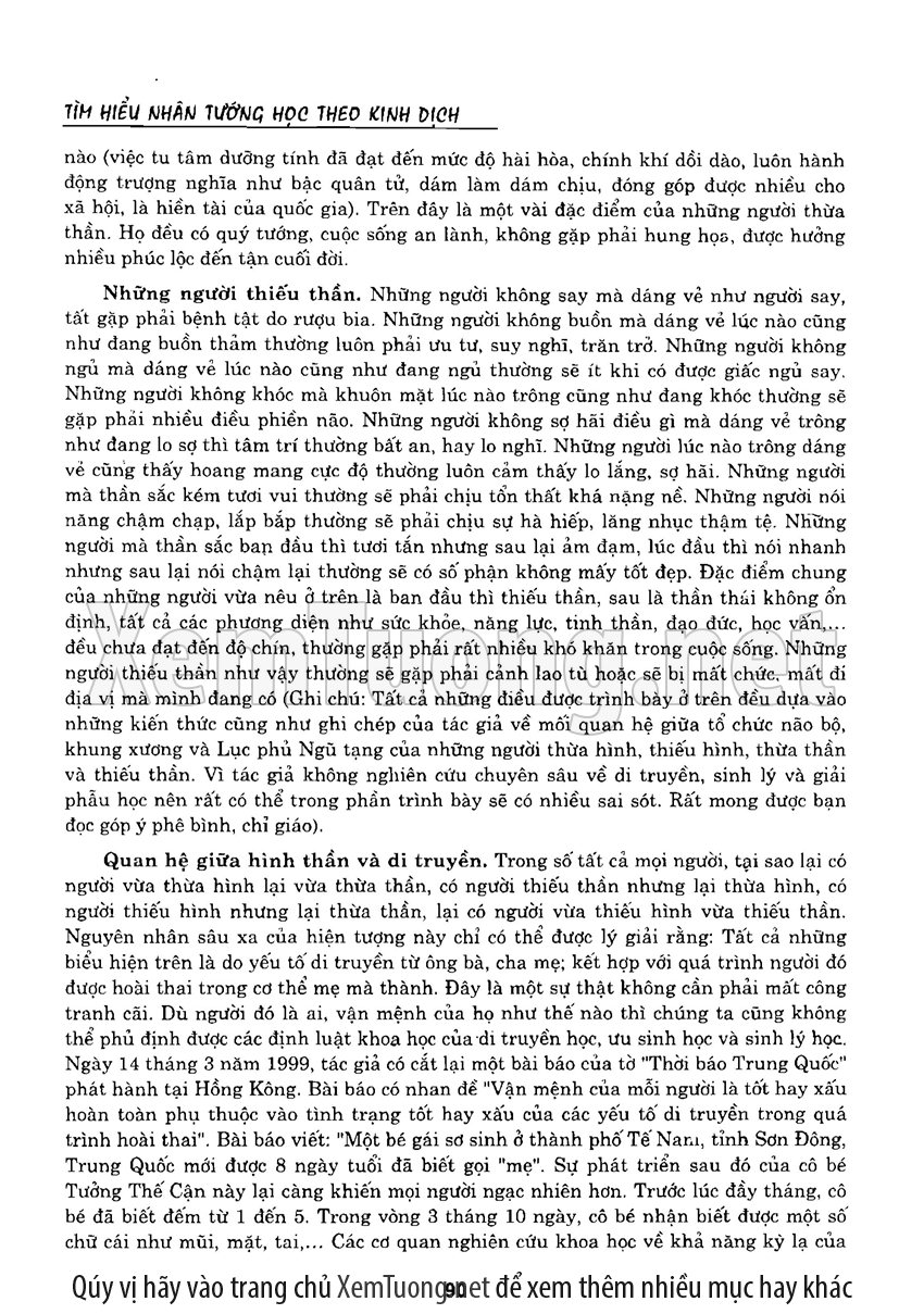 Sách "Tìm hiểu nhân tướng học theo kinh dịch" của tác giả Thiệu Vĩ Hoa cho chúng ta một cách nhìn toàn diễn về bản chất của thuật nhân tướng. Hầu hết chúng ta khi nói đến tướng thuật đều nghĩ đến khuôn mặt. Tuy nhiên như vậy có nghĩa là chỉ quan tâm đến phần hình dạng bên ngoài mà chưa chú trọng đến bản chất bên trong của thuật nhân tướng. Tướng thuật là nhìn tướng một người mà đoán được tuổi thọ, tài lộc, vận hạn... của họ, thậm chí của tổ tiên, cha mẹ, anh chị em trong gia đình người đó.
