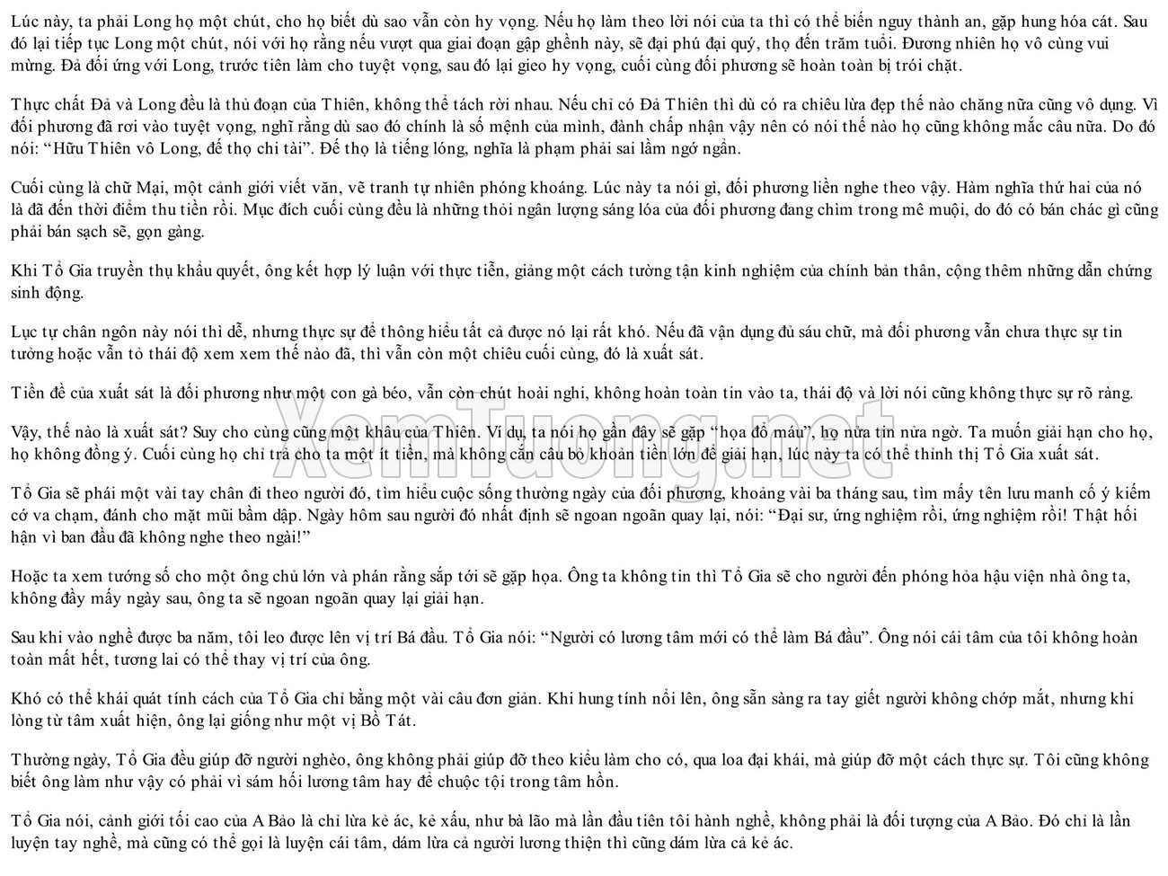 Tổ Gia nói: Xem là xem tướng mặt, đoán mệnh là đoán bằng bát tự, thứ phải nắm bắt một cách tinh tế chính là tia hy vọng, lòng tham, tâm hư vinh, sự đố kỵ, nỗi sợ hãi, tính ngạo mạn, có thể nói vận mệnh của một con người được biểu lộ rõ trên từng khuôn mặt. Kinh Hoa nghiêm nói: “Ác nghiệp tạo ra trước kia, đều do tham, sân, si vô cùng vô tận”. Nhược điểm trong bản tính con người chính là: tham, sân, si. Quan sát một cách tỉ mỉ thì dường như tất cả tai họa đều bắt nguồn từ đây. Một khi ba nhược điểm này bị lộ ra, “A Bảo” – kẻ lừa đảo bằng nghề tướng số, tất sẽ có cơ hội ra tay, nên không thể trách kẻ đi lừa, mà trách người để bị lừa.
