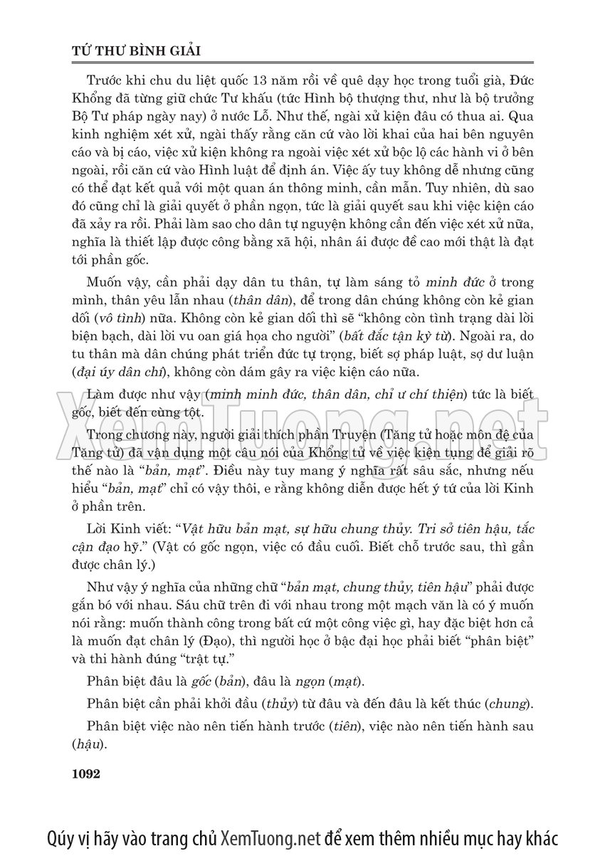 Sách "Tứ thư bình giải" của tác giả Lý Minh Tuấn nhằm cho chúng ta thấy được toàn bộ quá trình phát triển và trải qua thăng trầm của bộ tứ thư. Bộ sách này của Nho giáo ra đời cách nay khoảng hơn 2.000 năm, đã trải qua bao sóng gió theo những giai đoạn thăng trầm của lịch sử Trung Hoa. Lần thì bị Tần Thủy Hoàng đốt, lần thì bị tiêu tan trong các cuộc nội chiến triền miên của Trung Hoa. Do vậy khó tránh được nạn "tam sao thất bản". Đến đời nhà Tống, bộ sách này mới được các danh Nho tu chỉnh.
