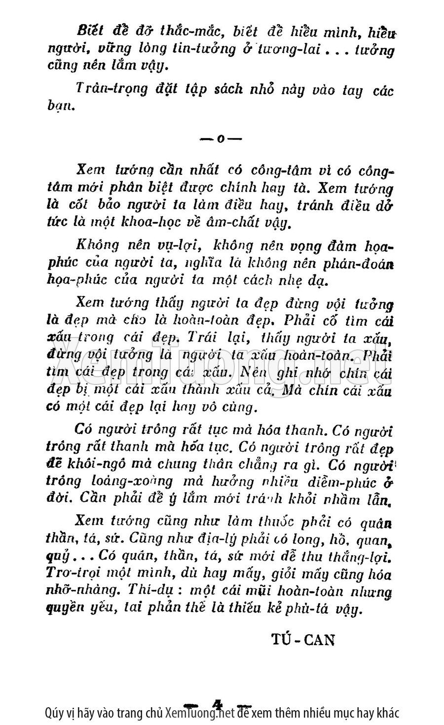Sách "Xem Tướng Lấy Theo Lối Tàu" của tác giả Tú Can sẽ giúp chúng ta trả lời các câu hỏi: Ta lấy người đó có nên không, người đó có phúc tướng không? Thọ hay yểu, có trở nên giàu có, có phú quý được không?có nên đi xa chuyển này hay không? Việc dự định làm thành hay bại, lợi ít hay lợi nhiều? Sinh con trai hay sinh con gái?..., chính vì vậy, sau nhiều năm nghiên cứu về khoa xem tướng của Tàu, tác giả đã viết nên cuốn sách này nhằm giúp bạn đọc phần nào hiểu được mình, được người, vựng lòng tin tưởng ở tương lai.